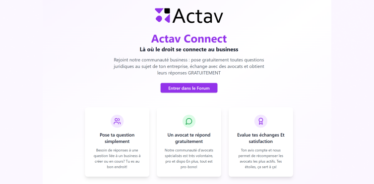 Rejoignez Actav Connect, notre forum où avocats et pros échangent directement. Posez vos questions et obtenez des réponses fiables GRATUITES, pour avancer sans stress.